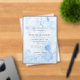 Elegant wedding save the date featuring your event details over a hand painted blue watercolor background.