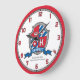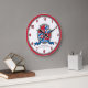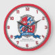 Knights style shield monogram letter K art name simple numbered wall clock in shades of red, blue white and grey. Personalise with your child's own name and name meaning for a personalised touch to your child's bedroom or nursery, this example is for names starting with the letter K. Currently reads Kennedy Helmeted chief. Regal, strong and enthusiastic. Ideal for a gift to a new baby boy, for a christening, baby naming or baby shower gift. Unique shield drawing, graphic art, name research, wording and design by Sarah Trett. www.sarahtrett.com for www.mylittleeden.com