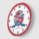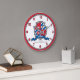 Knights style shield crest monogram letter K art name simple numbered wall clock in shades of red, blue white and grey. Personalise with your own name beginning with the letter K. Currently reads Kenny Fire born. Handsome, compelling with charm. Unique graphic shield design with a bird of prey eagle like face, crown and star. Original art, name research, wording and design by www.mylittleeden.com