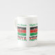 Personalised bone china mug shows the Kenyan Flag with the word KENYA below in the colours of the flag. Use the space provided to add your name, in green letters, for a personalised touch. Customise a gift by adding someone else's name instead. Design shows on three sides of mug. Fun to use at family reunions, travel groups, and clubs.