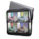 The colourful, original design on this 13” Laptop Sleeve was made from an original photograph by ZoeSPEAK of a bicycle parked outside a shop in Key West, Florida. Clothing from the shop hangs on the open door behind the bicycle. The photo is done in four colour schemes, red bike, blue bike, green bike and yellow bike, with corresponding clothing colours. The backgrounds are in muted shades of mauve and olive greys, and the overall background is a marbled black.