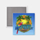 Key West beach sunset painting with palm trees, round bamboo frame, and a colourful parrot.