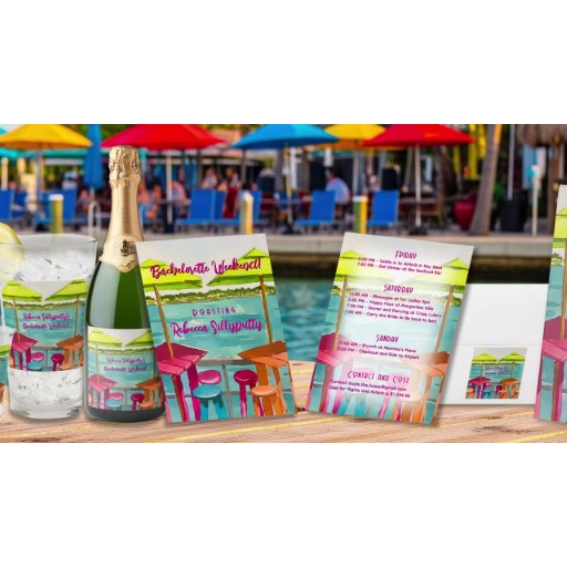 Pop the bubbly and celebrate the bride-to-be with these vibrant champagne labels! Featuring a cheerful design of beach bar tables with bright green umbrellas and lively orange and pink seating, these labels are perfect for personalising your bottles of champagne or sparkling wine. They'll add a fun, tropical touch to your bachelorette party, making every toast with the bride squad sparkle with island flair.