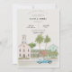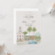This wedding invitation features a beach scene in Florida Keys where a beach is filled with palm trees and local greenery, with key wet houses\stores vibes.