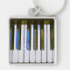 Study in Blue - The original artwork by ZoeSPEAK on this Keyring is a closeup of a piano keyboard, with an electric blue highlight on the dark piano keys, and reflections of the keys in the dark brown wood at the back. A thin line of soft red separates the wood from the keys.