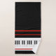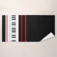 This whimsical bath towel set is perfect for pianist and musicians. The set features a piano keyboard wrapped around a white background, black and red accent. stripes. Keyboard Serenade also has a matching bath mat, a bath set and shower curtain. The set consists of a wash cloth, hand towel and bath towel. Pieces can be purchased individually or as a set.