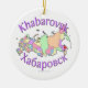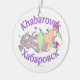 Colourful map ornament of the Russian Federation with Khabarovsk city location marked with a flag. City name also in Russian - Хабаровск. Unique Russia family or adoption or Christmas gift for families with children from Khabarovsk. Designed by Hendrika of www.RedThreadMaps.com