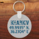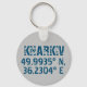 Modern keychain design features latitude and longitude coordinates for Kharkiv, Ukraine in distressed dark blue font on grey background