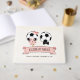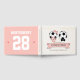 A sweet and sporty Kicking Off Forever soccer wedding guestbook with a bride and groom soccer ball on it. The bride soccer ball wears a pink bow and holds a bouquet of pink flowers while the groom soccer ball wears a black bowtie. The back of the soccer themed wedding guestbook can be personalised with the last name of the new couple and the last two digits of their wedding year for a sweet and sporty jersey look design. The spine can also be personalised with your own wording and title. This fun and adorable soccer themed wedding guestbook is perfect for the couple who loves to watch, coach or play soccer, or futbol and football, as it is known to rest of the world! Artwork © Chrissy H. Studios, LLC. All rights reserved.