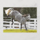 A Dapple Grey horse photographed mid-kick on a sunny Fall morning. Dapples are a colour variation most commonly seen on grey horses.
