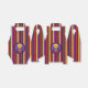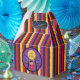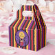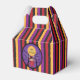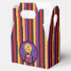 A Halloween favour box with red , orange , purple and black stripes and a kid wearing a red costume that looks like a devil ... but a sweet one :)