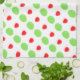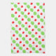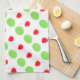 Designer kitchen or bath hand towel in greens, and red. Modern gum drop design.
