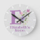 Design features Monogram & Name with Flowers either side in a water colour pastel style. Kids Bedroom Clock. Example name is Elizabeth. Change name as desired for anyone with a name beginning with E.