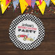 This fun race car Kids' birthday party has cute decor, for kids boy whimsical children, with a cartoon race cars track derby, cool auto racing sports cars, boys' birthday party paper plates, minimalist red yellow colourful, a retro chequered flag speedway, trendy stylish typography, kids birthday party supplies, a celebration fun classic