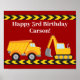 Cool custom construction vehicle red birthday party welcome poster for a child. A yellow dump truck and excavator decorate this fun decor for a little boy who loves cars and trucks. Customise with your kid's name under the black and yellow caution tape.