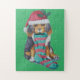 This cute little black and brown mixed breed Christmas puppy is looking very festive wearing his red santa hat with a sprig of holly in it. He's holding his red and green stripy Christmas stocking in his mouth as he eagerly awaits a visit from Santa Claus to fill his stocking with lots of gifts and other doggy goodies. He looks very special on this original seasonal jigsaw puzzle. The cute little puppy design really stands out against the festive green background. I think this unique christmas puppy picture makes great Christmas gift for the little ones.