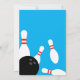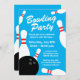 Kid's bowling Birthday party invitation template. Cool invites with black bowling balls and white bowling pins. Personalise with your own name and text. Fun game activity for kids and adults. Blue or custom colour background. Let's strike up some fun!