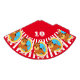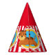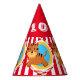 Set against a vertically striped red and white background is a cartoon tiger jumping through a red and white hoop that has a white, yellow and blue center all framed by vertical bright red and white stripes above which is the birthday boy or girls age. The hat resembles a circus / carnival tent.