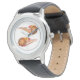 Kids classic leather strap watch shown in black with a sporty flaming basketballs print.