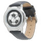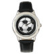 Kids classic black leather strap watch shown with a soccer ball print. Choose this watch from several styles. Customise this watch or buy as is. Stock Image