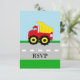 The background contains a grey asphalt road with white markings, green for grass and blue for a sky. A great theme for a boys birthday party, builder and building trades or children's big machine theme room decor. All Designs Copyright © www.CustomInvitesOnline.com