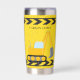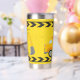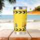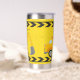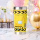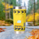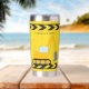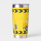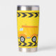 Cool custom construction excavator tumbler gift for a child who loves yellow construction vehicles in black and yellow. Fun vehicle gift for a little boy who loves cars and trucks. Customise with your kid's name under the black and yellow caution tape. The back features a dump truck.