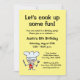 Kid's cooking Birthday party invitation template. Custom invites for children. Personalise announcement text, age number and background colour. Fun drawing of chef cook cartoon holding fork and knife.