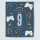 This cool and modern video game-themed kids birthday party welcome sign design features a blue gaming cartoon design, with a controller, headset, health hearts, lightening bolts, coins, and stars. The poster can be personalised with your boys name and age. The perfect gamer-themed decor for child's birthday party.