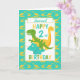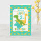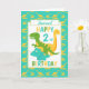 A fun 2nd birthday card. This bright second birthday card features a cartoon green T-Rex dinosaur, a yellow Brontosaurus and a blue Triceratops, set on a blue and yellow dinosaur background A lovely cute design for a little boy who will be two years old. The birthday age and the child's name on the front of the card can be changed to customise it for that special little boy , Then amend the inside message to personalise the card.