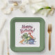 This cute green dinosaur happy birthday square paper plates design shows adorable watercolor dinosaurs of various colours. This design also shows festive confetti as well as the phrase "happy birthday". The main colour scheme is greens, reds, and blues. Enjoy this fun kids birthday party paper plates design!