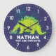 Graphic art wall clock featuring a Stegosaurus dinosaur. Perfect for budding dinosaur paleontologists and dinosaur friendly kids bedrooms. Personalise with your own name and words, currently reads Phillipp you are dino-mite.