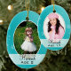 Customise this blue Christmas ornament with a photo on both sides. Text can be added to customise with name(s) and age(s) or any text you prefer. Made as a template to hold pictures from childhood and the teen years for one person, but can also hold the photos of two separate kids, or twins, any family members or pets. Oval ceramic, with little snowflakes, to hang by a gold cord.