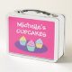 Kid's lunch box with custom cute cup cake print. Retro style metal lunch box with name of child. Personalised gift ideas for little girls going to kindergarten and preschool. Old school shiny metallic lunchbox with handle. Cute Birthday or Holiday gift idea for granddaughter, daughter, cousin etc. Add your own name, monogram initials or funny quote. Sweet treats drawing. Available in pink and other colours.