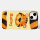 A bold colourful kids tiger face iphone case taken from a original painting by Sarah Trett. A cute tiger case for cat lovers. Personalise with the name of your choice, currently reads Bailey.