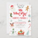 Cute oh what fun Christmas birthday invitation featuring a red retro font style heading, sleigh, Santa Claus, ginger bread man, reindeer, snowman and more.
