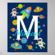 A fabulous personalized outer space poster for a kids bedroom. Features a rocket ship, astronauts, planets - and of course an alien! Perfect for boys bedroom decor or as a nursery print.
