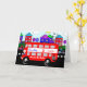 Such a cute kids happy birthday card with sunshine and blue skies over a little town where a big red bus is driving through with the child's personal name and age down it's side.