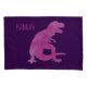 Kids Personalised Dinosaur Silhouette Purple White Girls Pillowcase. Front of pillow has silhouette of purple t-rex and name to personalise. Backside of pillowcase is a fun pattern of pink purple and green dinosaur watercolor silhouettes. www.SamAnnDesigns.com