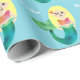Personalised Faux Foil Blonde Mermaid Wrapping Paper. Adorable blonde, light skinned mermaid with faux foil pink top and green tail. Pink faux foil seashell in her hair. Fun for a mermaid themed party or mermaid shower gifts. The background is light ocean blue. Personalise with name, edit to change font colours and styles. Coordinating mermaid, merman, and pirate party supplies. Contact for custom order requests. Mermaid, ocean, sea life themed designs. ww.SamAnnDesigns.com