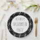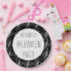 Kids Personalised Skeleton Pattern Halloween Party Paper Plates. Personalise plates with name and Happy Halloween or edit text to change. Black background with white skeletons pattern. White circle in centre with text inside. Check out our other fun and spooky kids Halloween party supplies.
