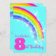 Cute modern rainbow and star graphic colourful rainbow party invite in aqua and pink. Perfect to invite your daughter's favourite friends to her birthday party. Customise with your own details and age. Uniquely designed and illustrated by Sarah Trett.