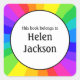 A rainbow bookplate sticker. This is a sticker to put inside a book with the owner's name in a white circle surrounded by bright rainbow coloured stripes.