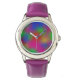 The watch looks exactly as depicted. I was especially pleased with the watch band, which is a nice quality, supple leather. I point this out because an option, which was sold out, was with a multi-colored but clearly plastic band. This is the better choice, in my view.