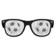 Kids retro party sunglasses are shown in the black frames with a sports soccer ball print on the lenses.