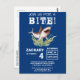 Invite friends and family to come join you for a bite with this cute shark birthday party invitation postcard. This design features a dark blue background with a happy, laughing shark with seaweed and he's swimming in the ocean. The back of the card features a preprinted return address. Personalise this item with the name, age, date, time, address, and rsvp info. The font and colour are customisable. Perfect for a boy's birthday party. Need help? Just contact us and we'd be happy to help you with your special personalisation.