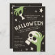 This spooky Halloween party invitation is perfect for a children’s party or kids Halloween event. The design features cream text on a black background with a textured illustration of a skull and bone being held by a spooky witch’s hand surrounded by stars.