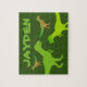 Kid's T-rex dinosaur puzzle with custom name. Prehistoric wild animal illustration with personalised text. Fun Birthday or Christmas gift idea for boys and girls into dinos. Green Terranosaurus rex silhouettes with bold typography template. Choose from small or big pieces to play with. Cute custom toys for children.