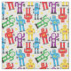 Colourful kid's patterned fabric covered with red, blue, purple, yellow and green retro toy robots and aliens on white