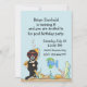 Stylish child's birthday invitation, done in pale blue, with adorable graphics of a scuba diver, with a colourful fish. Text in black is fully customisable to suit your party needs. Great pool party invitation or treasure hunt style party for boys or girls.