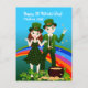 A boy dressed in green and a cute girl dressed in a pretty green dress with printed shamrocks fabric and wearing an emerald-green top hat is cheering and clapping her hands because it’s also her birthday.